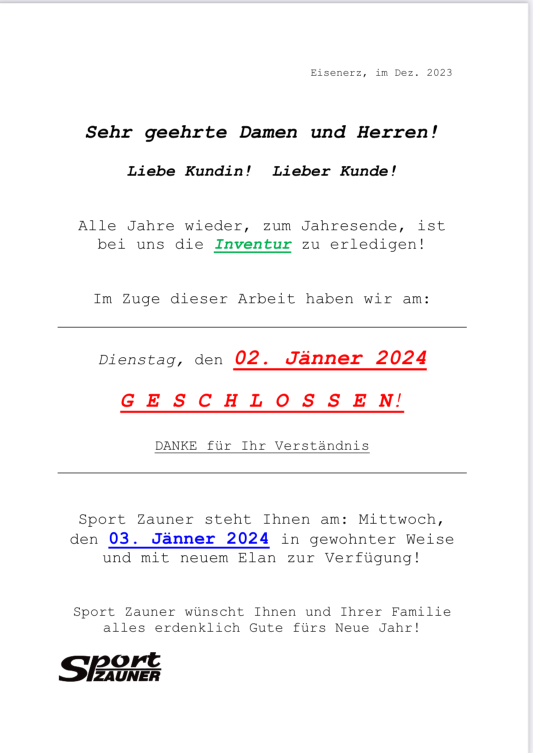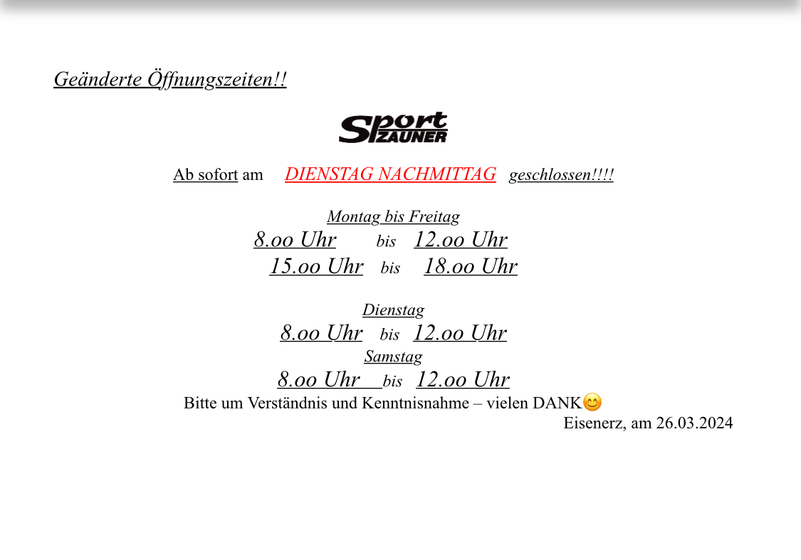 Liebe Freundinnen und Freunde des Sport Zauner - wir haben am Dienstag den 14.04.2020 wieder für Euch geöffnet.